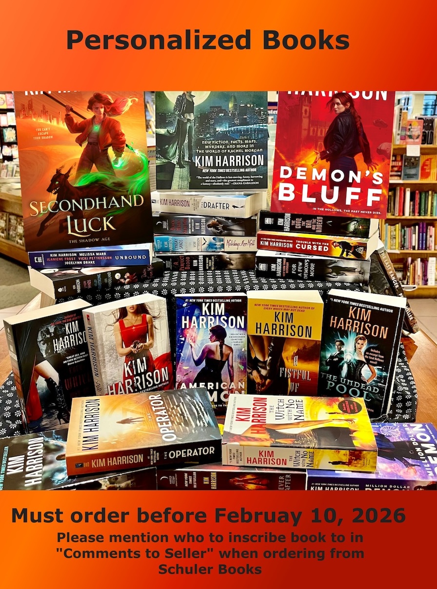 Schuler Books, my local store, is offering signed-to-you copies of all available Kim Harrison and Dawn Cook titles until February 10th, 2026. Please email them from their website for international orders.
